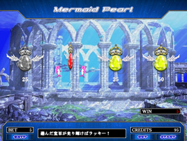 | 人魚を主人公にしたスロットマシーン「マーメイドパール」は、RyotyCoinを"1BET~5BET"まで賭ける事が可能です。多種多様な液晶演出が搭載されています。 3つの図柄が揃えば、揃った図柄の配当GET!第三リール限定のボーナス図柄や、一撃5000枚のスペシャル図柄も見逃せない! |